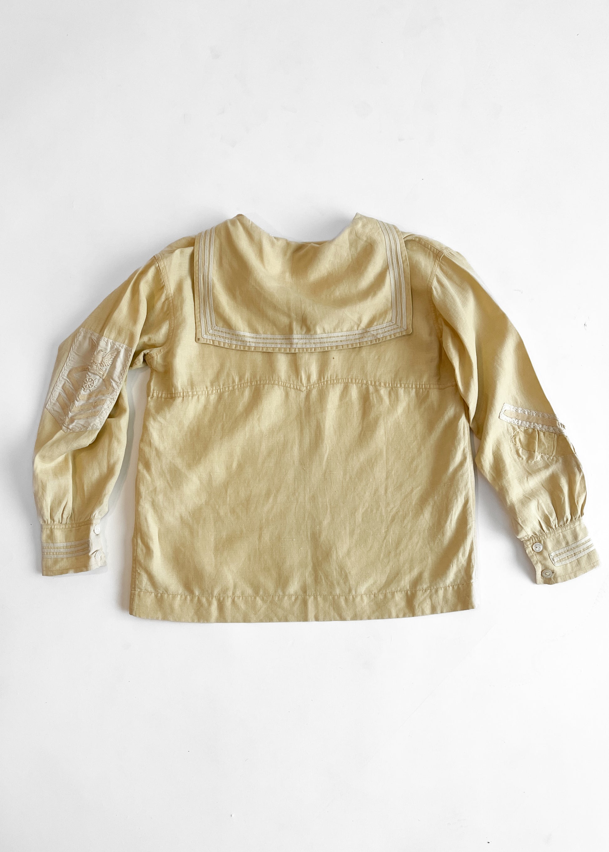 Beautiful 1920s midi sailor-style top. Pale yellowish-beige linen with white accents. Large nautical eagle patch on the sleeve. Slips on over the head.