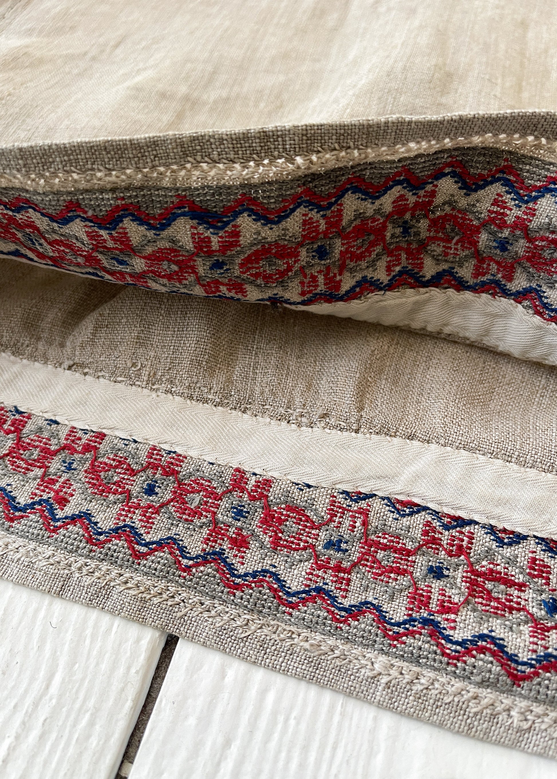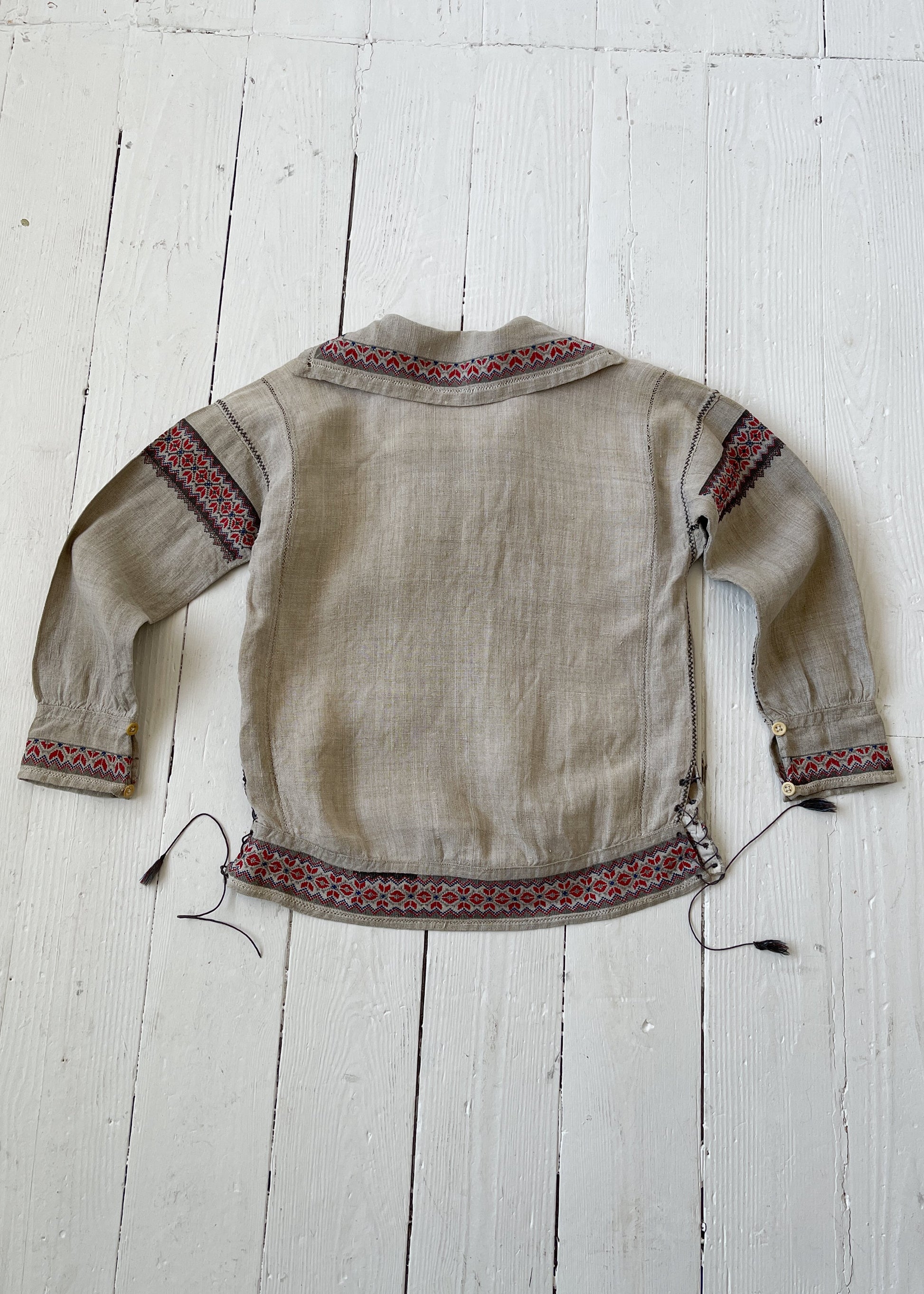 Such a rare piece! Unbleached flax (or maybe hemp) with a slightly stiff feel. Sailor collar with a lace up front. Lace up at sides. Hand embroidery accents in the Arts and Crafts style. Contrast stitching. Most probably from Eastern Europe based on the embroidery. Meant to be worn oversized.