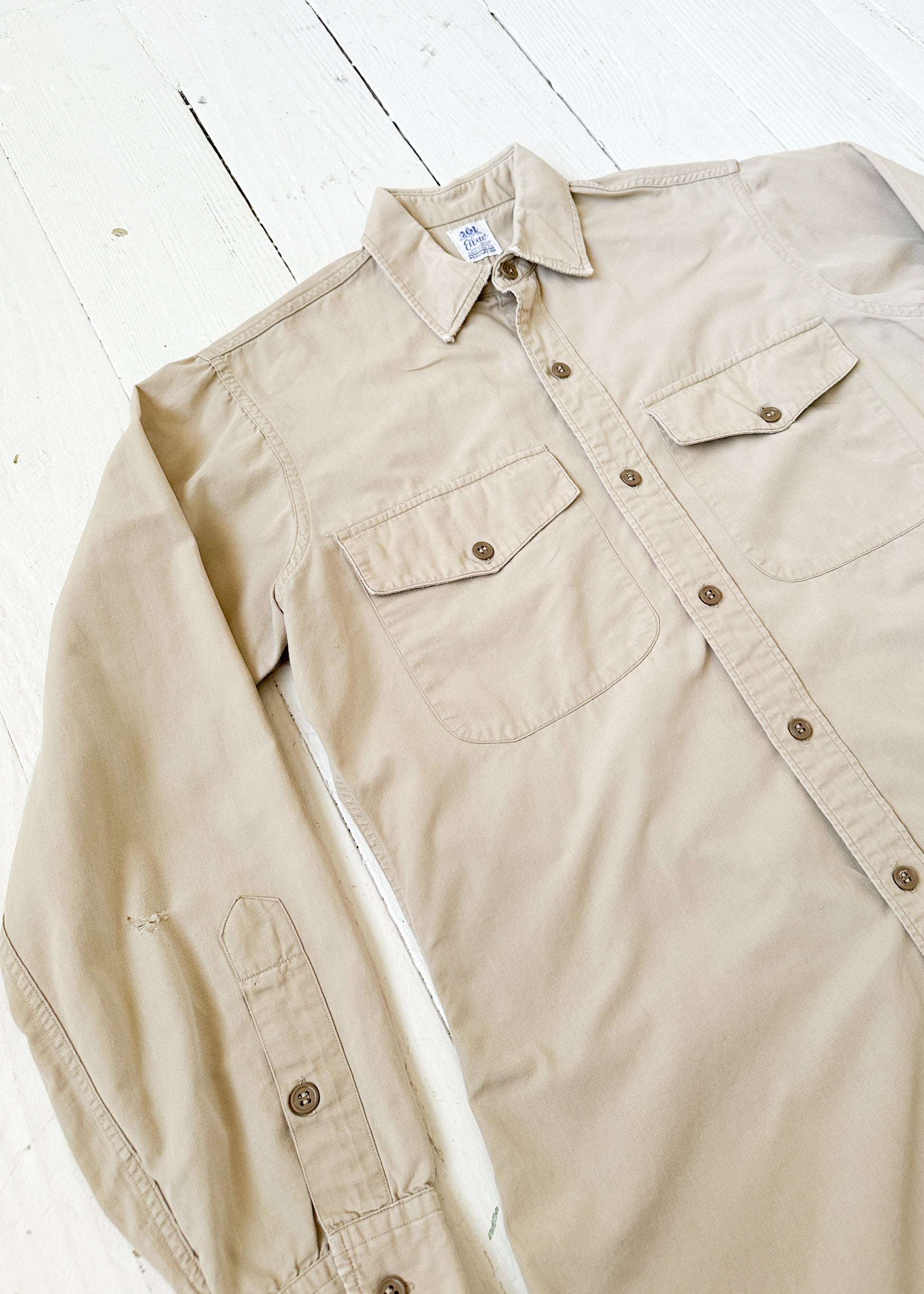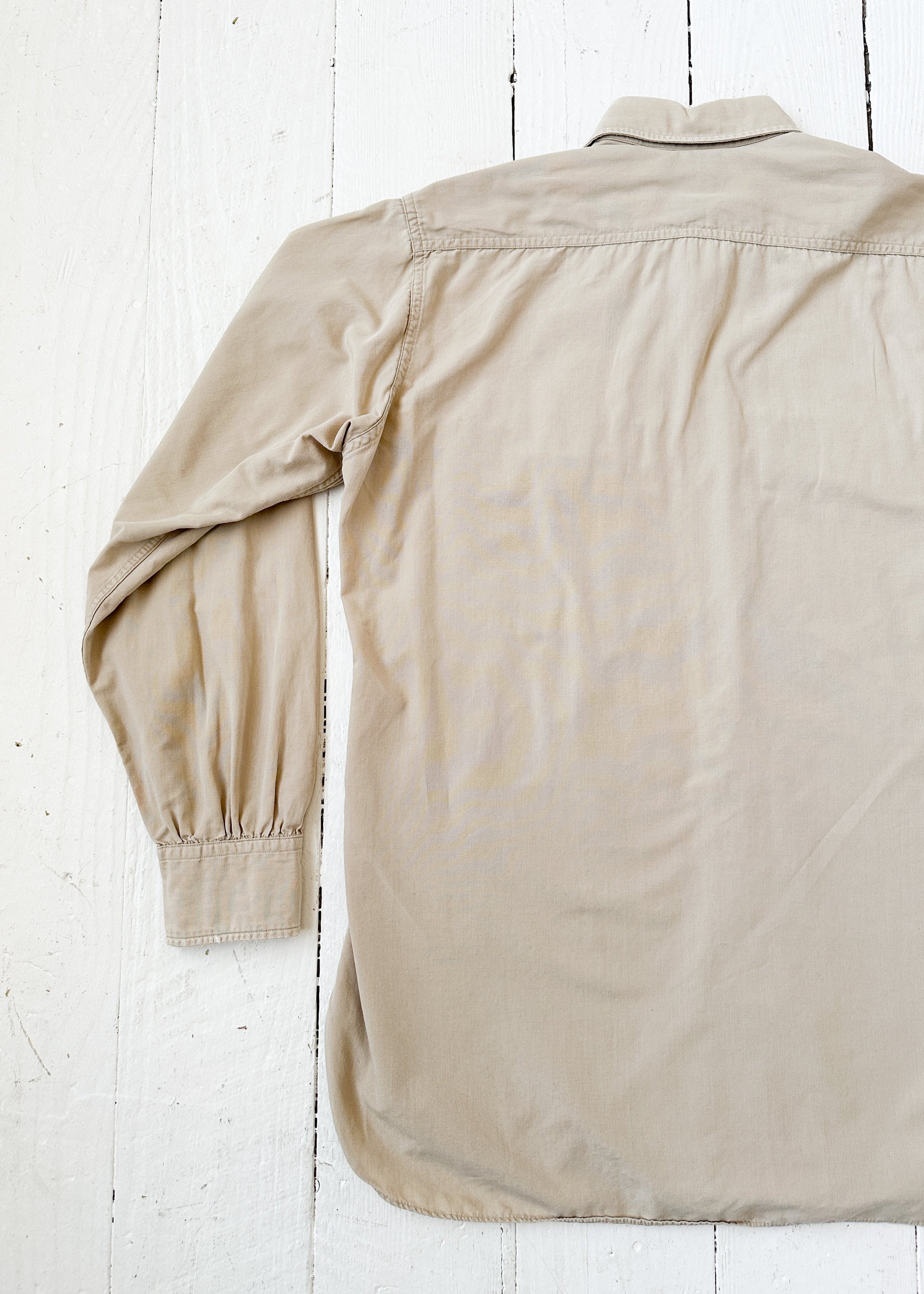 WWII era regulation shirt. Perfect for layering. Mid-weight khaki cotton. Two front chest pockets.
