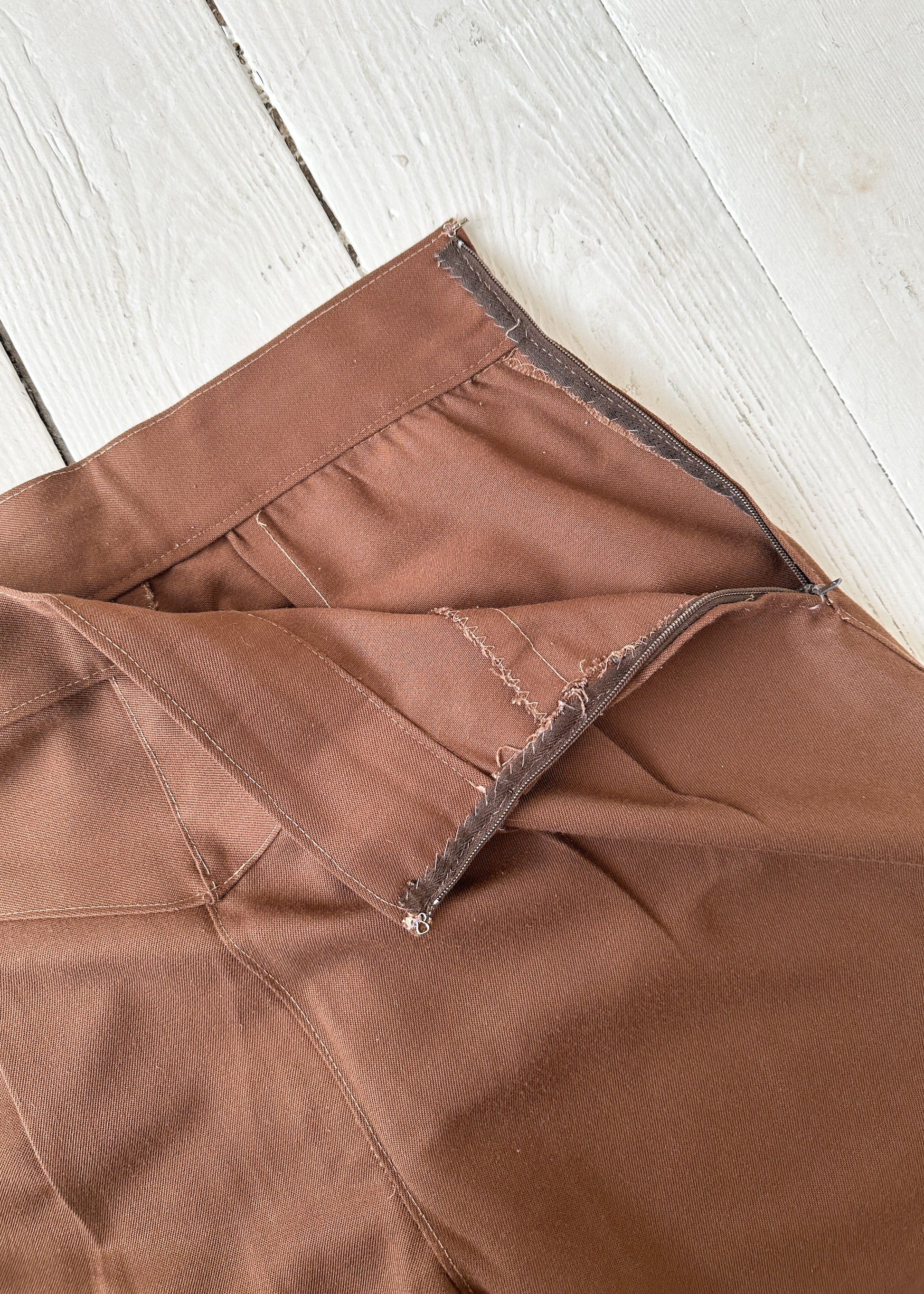 1960s-does-1940s style trousers with yoke front ands pleats. No material tag but feel like cotton. Side zip closure. Handmade, zipper might suggest European. Contrast stitching. Slightly cropped length. Unlined.