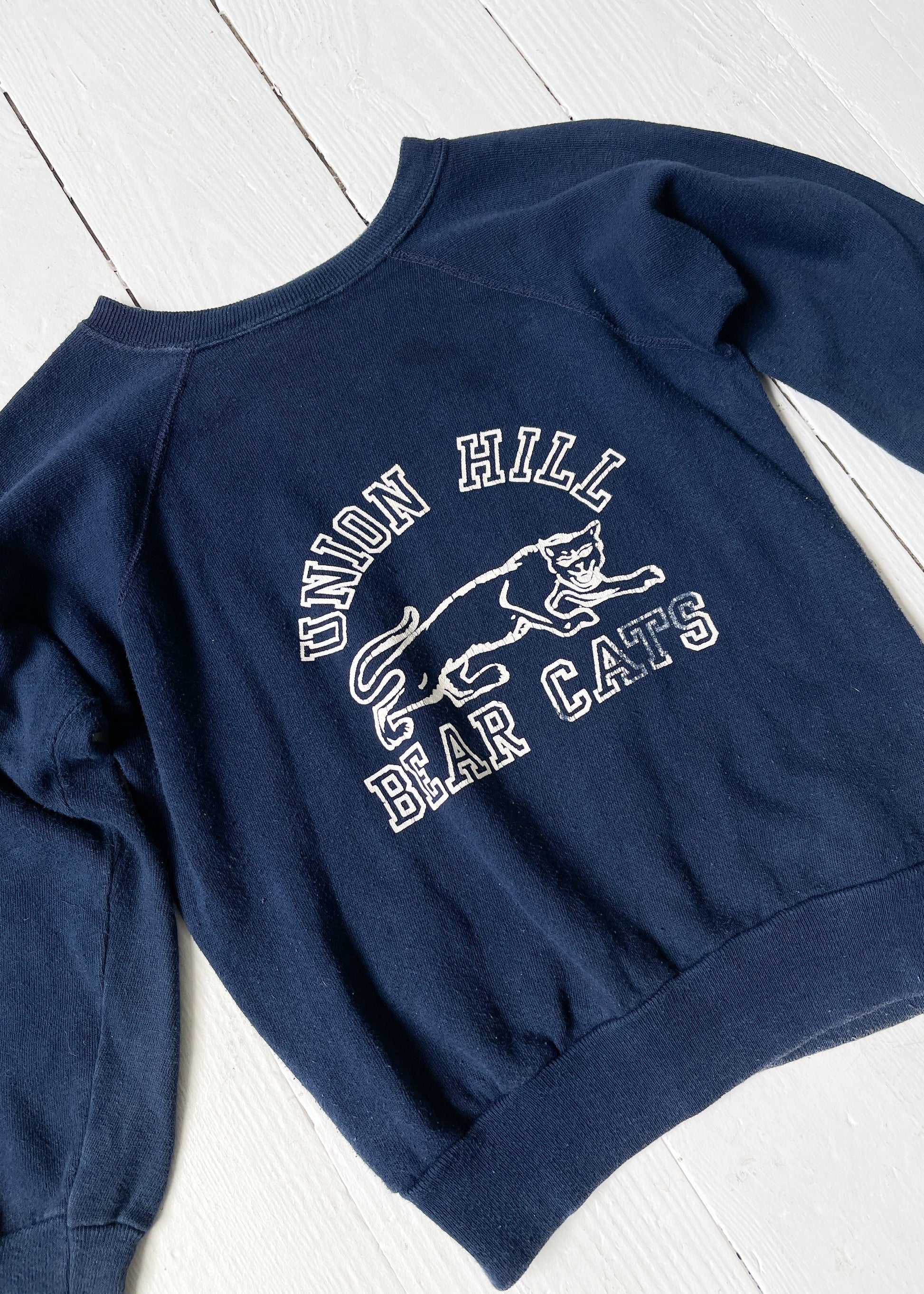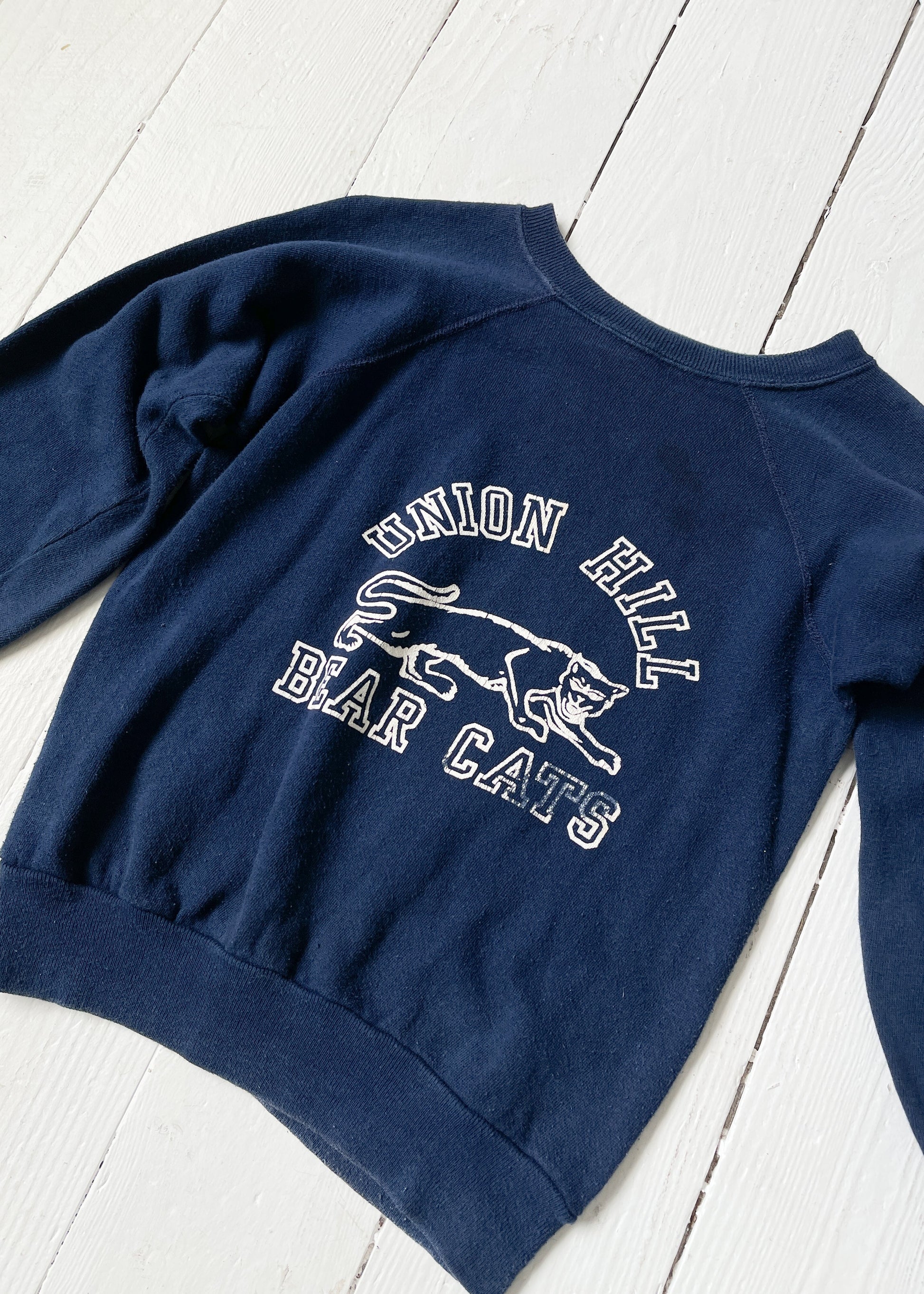 Iconic 1960s bearcats school logo cotton sweatshirt. Navy and white logo. Raglan sleeves.