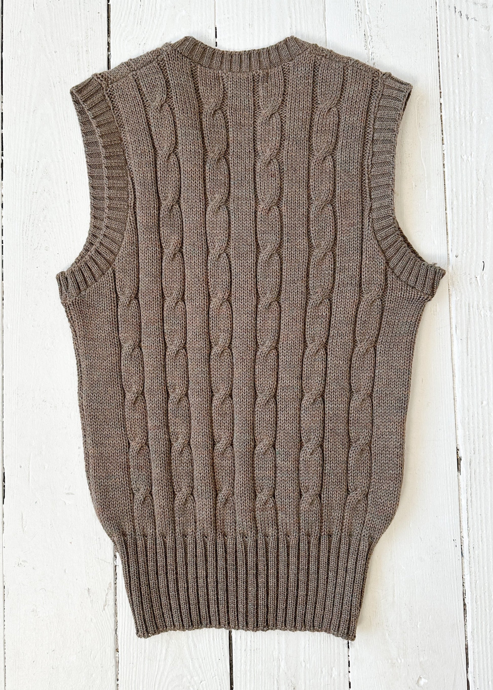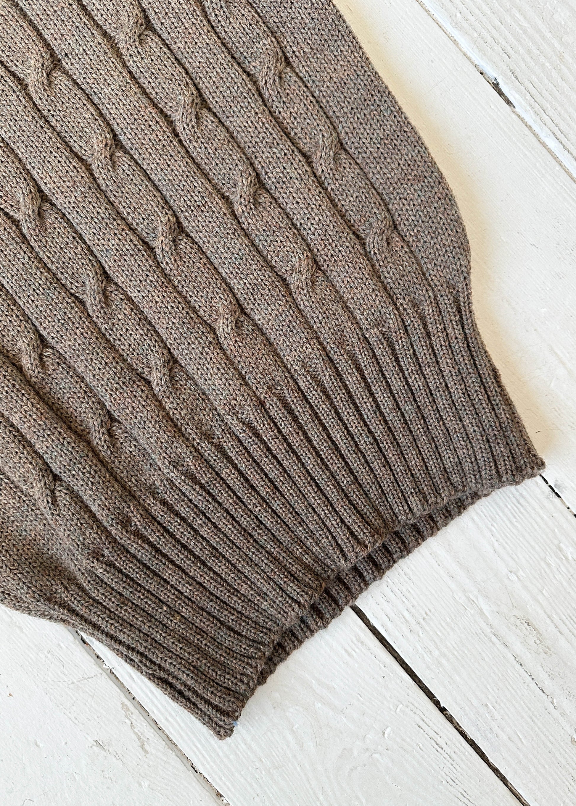 Such a classic! Taupe cable knit wool. Wide waistband. Perfect way to complete your layered fit.