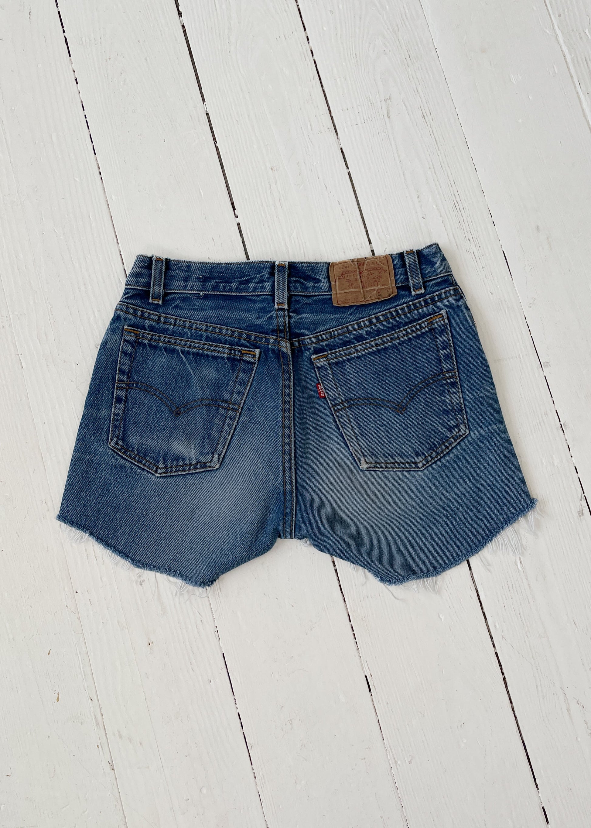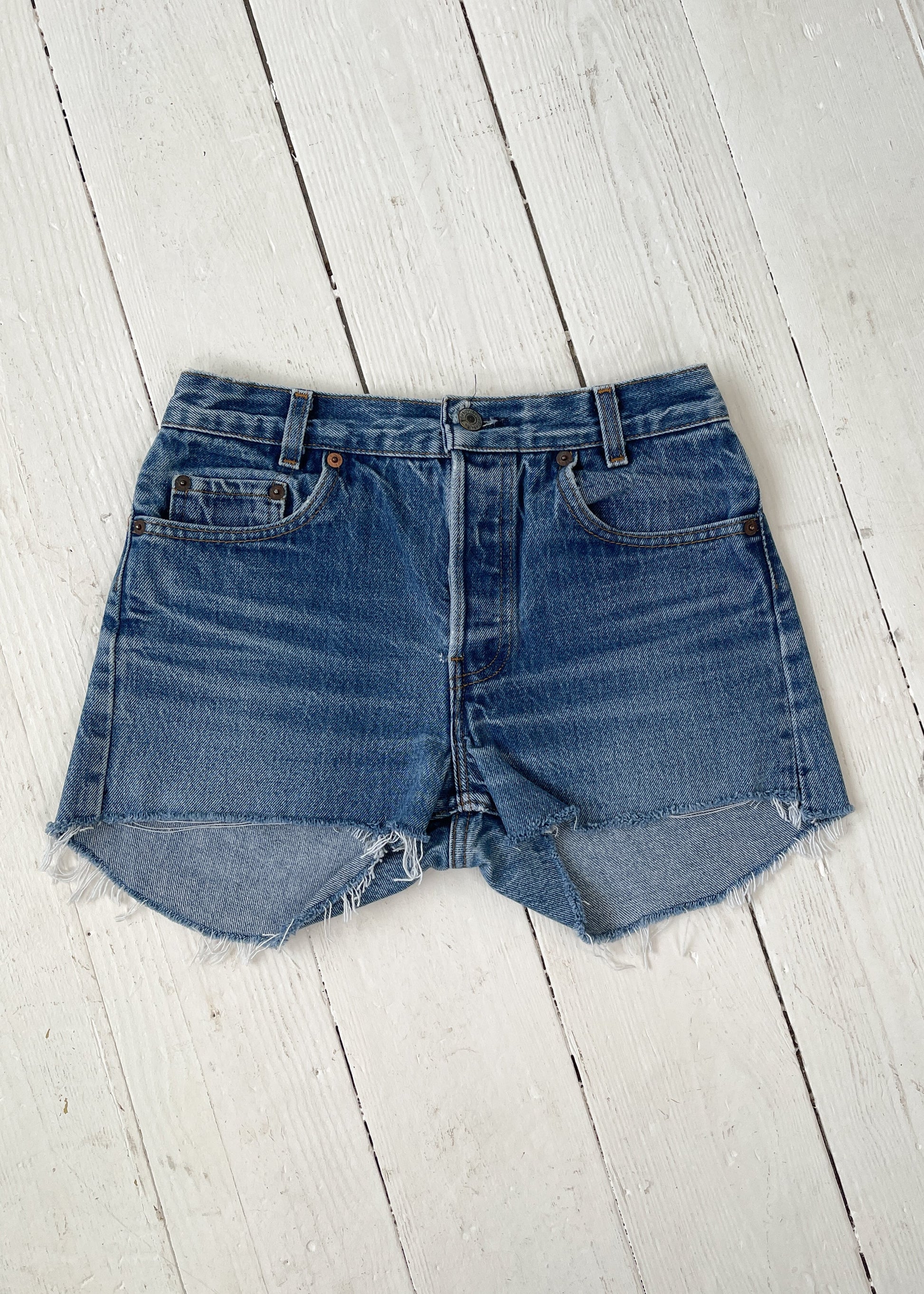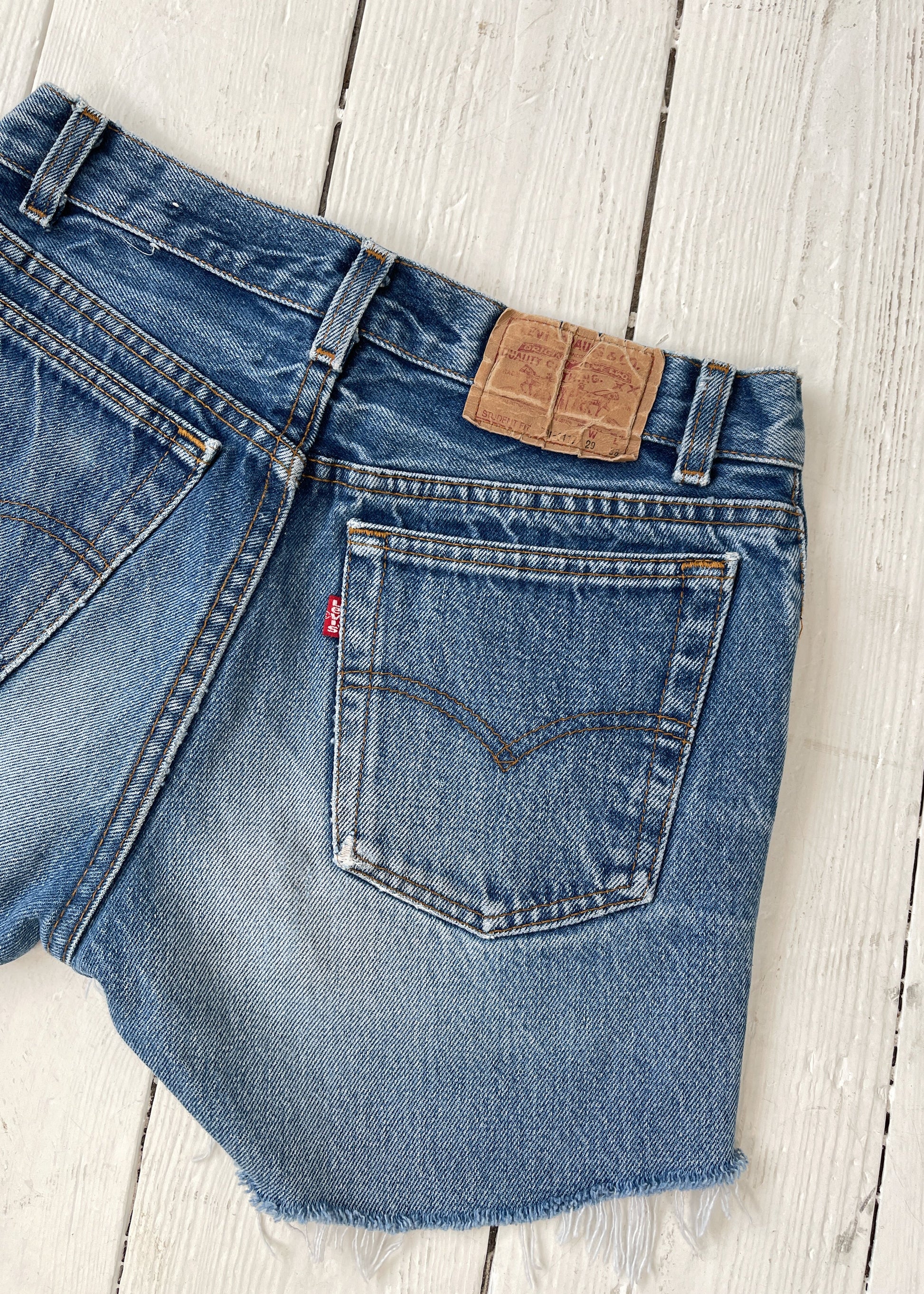 A summer staple. 1970s 701 Student Fit cut off cotton jean shorts. Button fly.